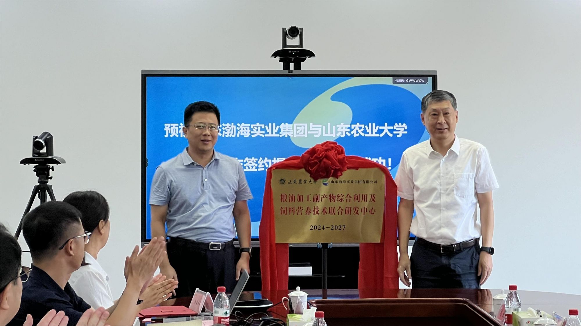 博兴县副县长刘中秋与山东农业大学副校长林海共同为“粮油加工副产物综合利用及饲料营养技术联合研发中心”揭牌。